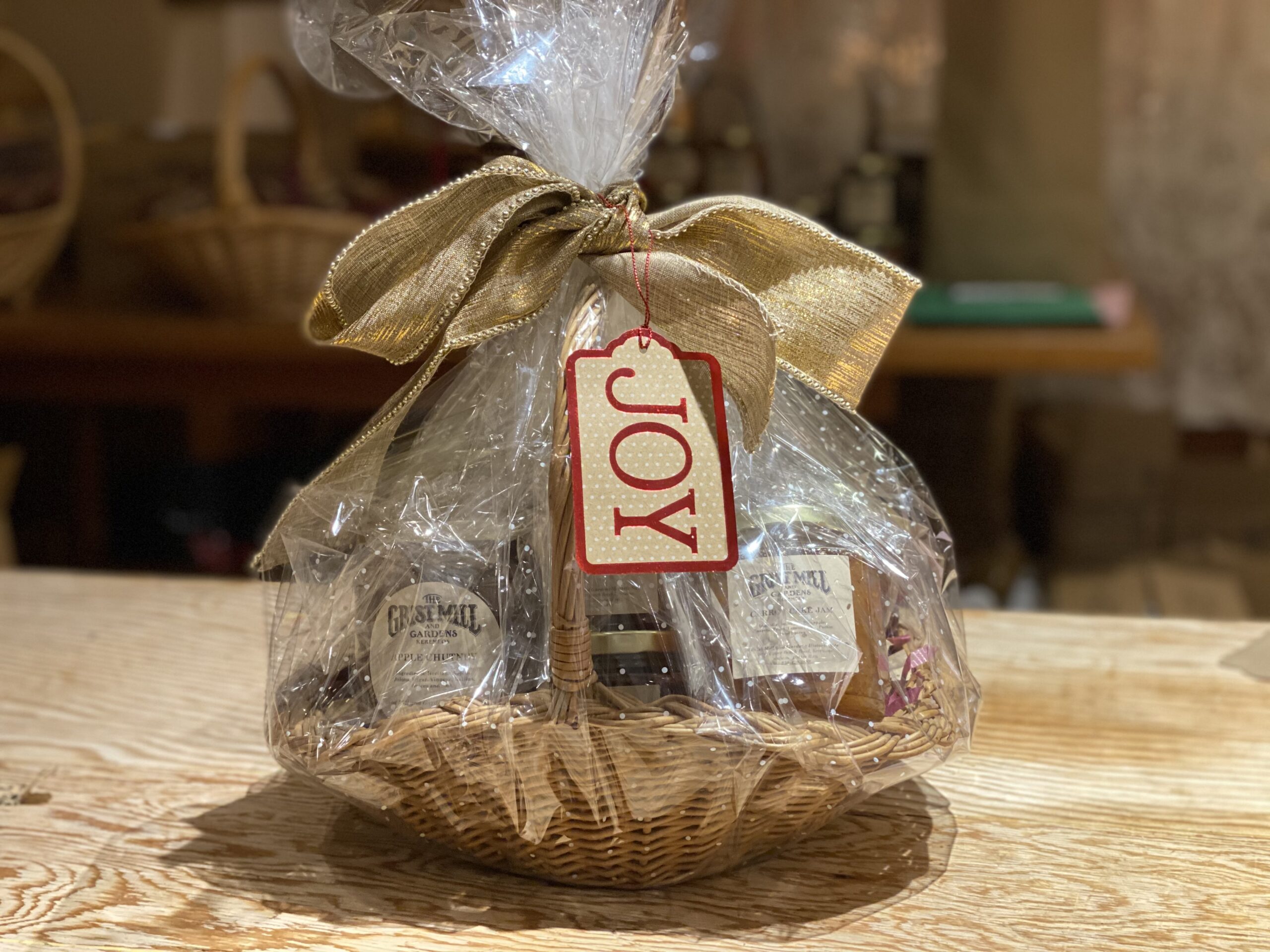 All baskets, regardless of size, are padded with raffle or similar material, wrapped in cellophane and finished with a bow and a gift tag.